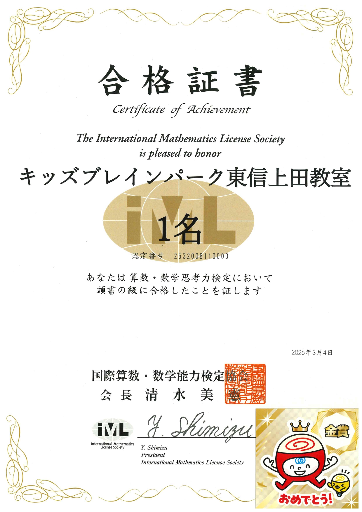 思考力検定7級 合格のお知らせ